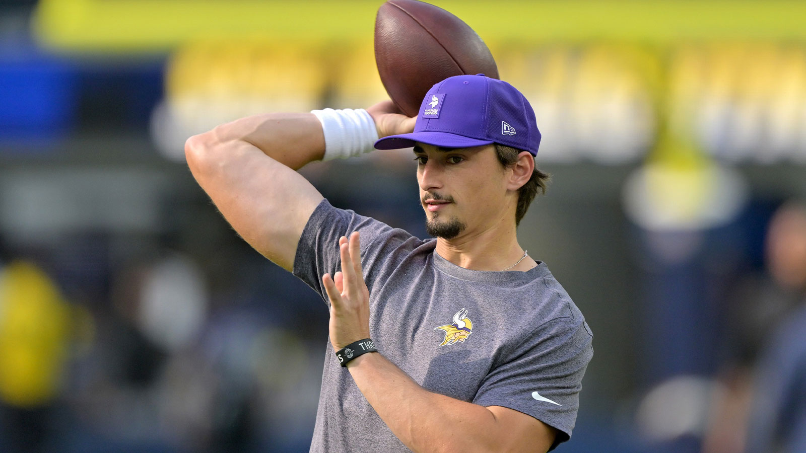 Oct 23, 2025; Inglewood, California, USA; Minnesota Vikings quarterback Max Brosmer (12) warms up prior to the game against the Los Angeles Chargers at SoFi Stadium. Mandatory Credit: Jayne Kamin-Oncea-Imagn Images